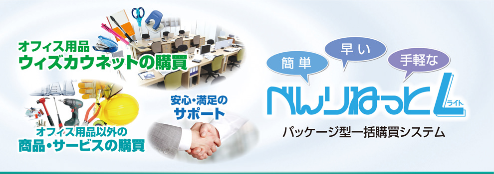 べんりねっとL(ライト)は、当社が提供するオフィス用品「ウィズカウネット」と、オフィス用品以外のさまざまな商品・サービスの購買に加え、購買管理機能を備えたパッケージ型一括購買システムです。